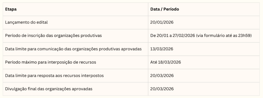 Para garantir total transparência e facilitar o planejamento das organizações interessadas, o cronograma abaixo reproduz todas as etapas previstas no edital: