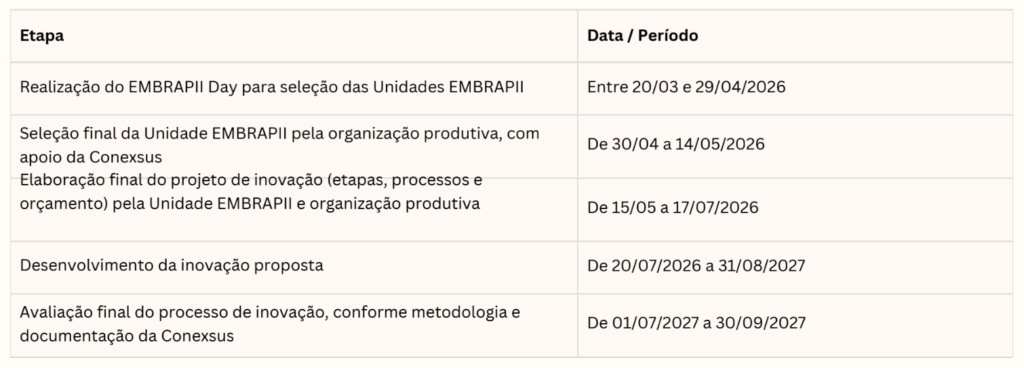 Uma vez selecionadas as organizações produtivas, o processo de desenvolvimento das inovações observará o seguinte cronograma: