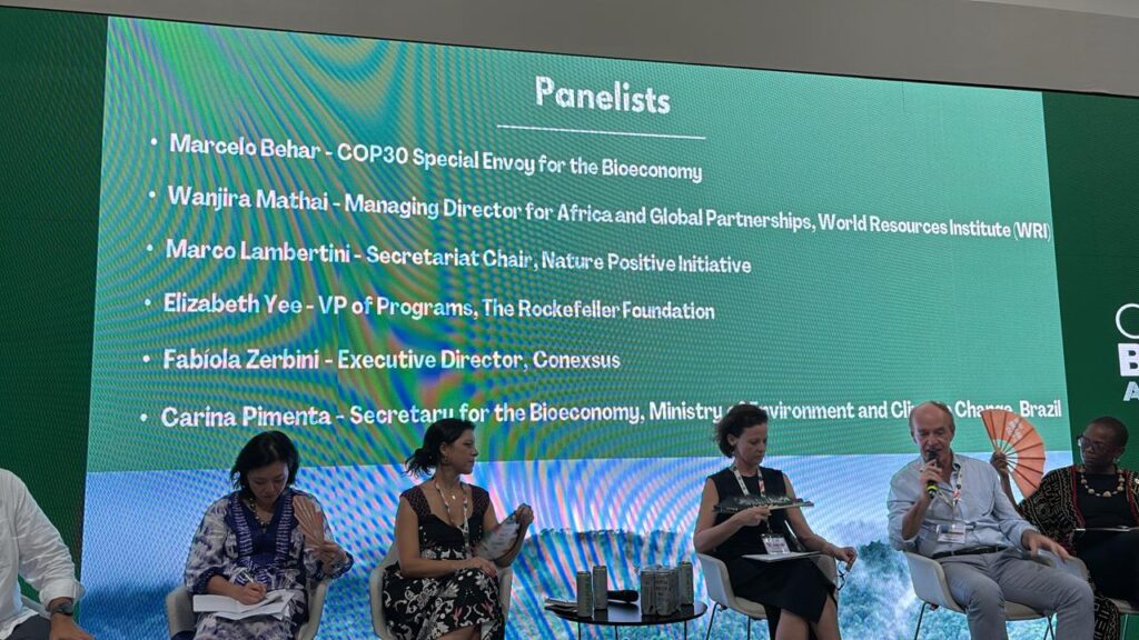 O painel contou ainda com a participação de Wanjira Mathai (Managing Director for África and Global Partnerships, WRI), Marco Lambertini (Secretariat Chair, Nature Positive Initiative), Elizabeth Yee (Vice-Presidente de Programas, The Rockefeller Foundation) e Carina Pimenta (Secretária de Bioeconomia do Ministério do Meio Ambiente e Mudança do Clima), sob moderação de Marcelo Behar, Enviado Especial pra Bioeconomia da COP30.